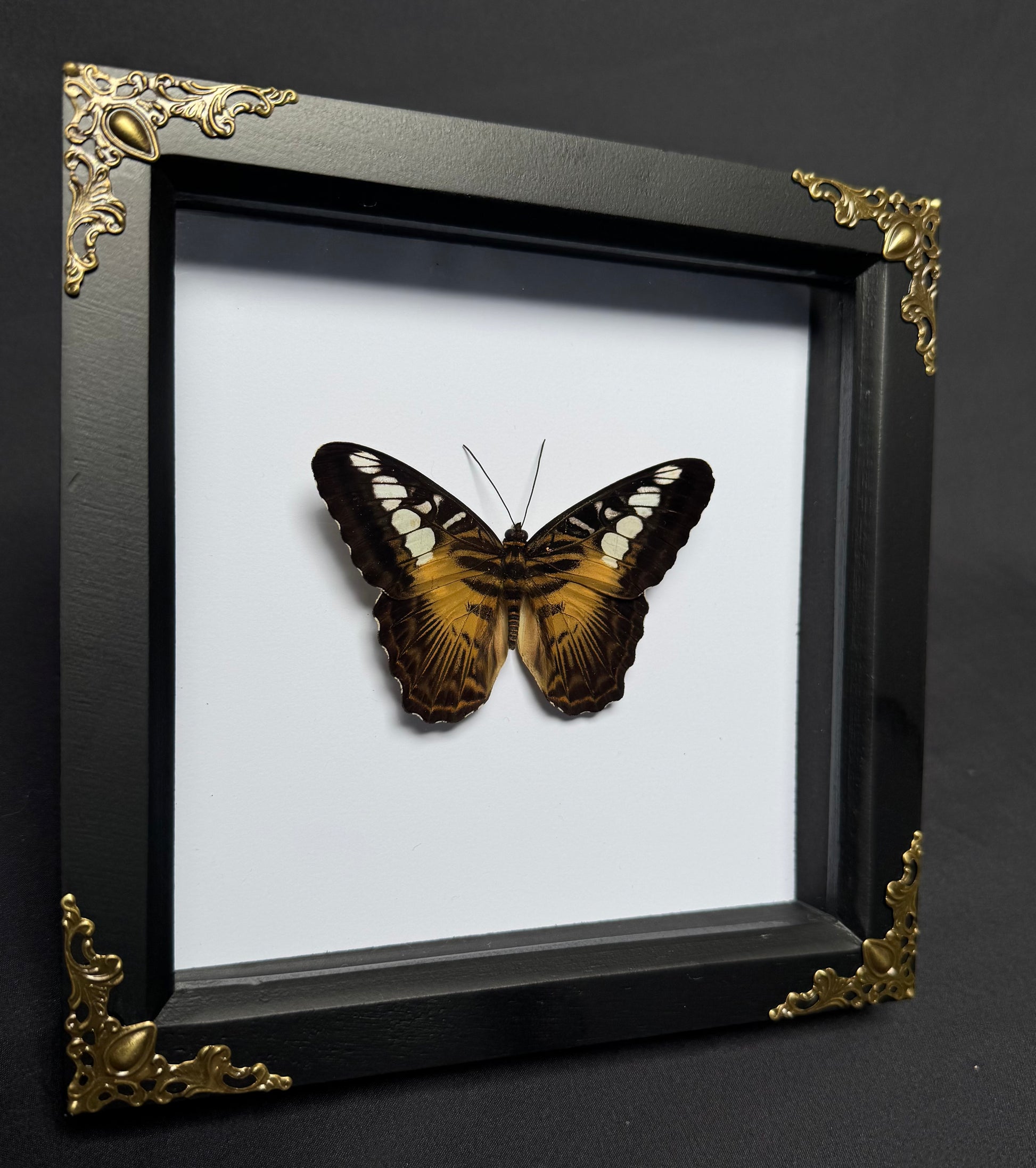 π¦ Black shadow box frame with ornate brass corner detailing